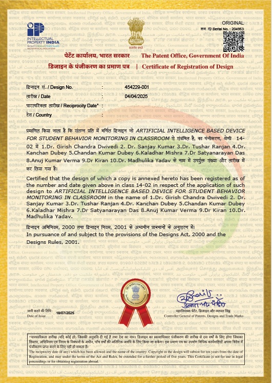 महाविद्यालय के शिक्षक -शिक्षा (बीएड) विभाग के सहायक आचार्य श्री अनुज कुमार वर्मा (असिस्टेंट प्रोफेसर) एवं सहायक आचार्य डॉ किरन (असिस्टेंट प्रोफेसर) एवं उनकी टीम को ‘’ARTIFICIAL INTELLIGENCE BASED DEVICE FOR STUDENT BEHAVIOR MONITORING IN CLASSROOM’’ पर Design registration प्राप्त हुआ| यह उपलब्धि शिक्षा एवं शिक्षक प्रशिक्षण के क्षेत्र में एक महत्वपूर्ण कदम है और हमारे महाविद्यालय के गर्व व् सम्मान की बात है I शिक्षा का मुख्य उद्देश्य विद्यार्थी के व्यवहार में परिवर्तन लाना होता है I चूँकि प्रत्येक विद्यार्थी का अपना व्यक्तित्व होता है जिसके द्वारा उसका व्यवहार निर्धारित होता है I व्यवहार में सकारात्मक परिवर्तन ही सीखना या अधिगम कहलाता है I कक्षा में विद्यार्थियों के व्यवहार को इस डिवाइस के द्वारा रिकार्ड किया जा सकता है उनको दिखाया जा सकता है साथ ही शिक्षक भी उसको देखकर अपनी शिक्षा शैली में सुधार कर सकता है साथ ही विद्यालय प्रशासन के द्वारा प्रत्येक विद्यार्थी के व्यवहार पर नजर भी रखी जा सकती है I शिक्षक-प्रशिक्षण में सूक्ष्म शिक्षण एवं कौशलों का विकास करने में भी यह डिवाइस महत्वपूर्ण भूमिका निभा सकती है I यह डिवाइस ARTIFICIAL INTELLIGENCE पर आधारित है जो आधुनिक तकनीकी क्रांति के अनुरूप है I