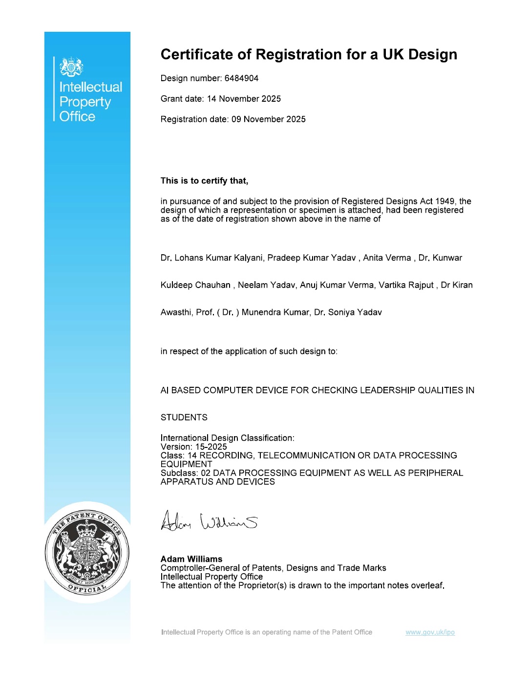यह एक एआई-आधारित कंप्यूटर उपकरण है जो नेतृत्व का वस्तुनिष्ठ मूल्यांकन और निगरानी करने के लिए बहुआयामी डेटा के माध्यम से छात्रों में नेतृत्व गुणों की पहचान और विश्लेषण करता है। यह डिवाइस कक्षा में इंटरैक्टिव सत्रों, समूह गतिविधियों, प्रस्तुतियों, खेलों, सांस्कृतिक कार्यक्रमों या किसी भी अन्य कार्यक्रम के दौरान डिवाइस पहने हुए छात्रों के दृश्य और श्रव्य इनपुट को कैप्चर करता है। उपकरण में लगा AI -इंजन इस इनपुट को प्रोसेस करके उसको विश्लेषण करता है और नेतृत्व से जुड़े पेरामीटर जैसे पहल करना, निर्णय क्षमता, बातचीत में स्पष्टता, आत्म विश्वास का स्तर, शारीरिक भाषा, सहयोग, कार्य समन्वय, समय प्रबंधन, साथियों के प्रति सहानुभूति एवं असाइन किए गये रोल में जिम्मेदारी कि आदत की पहचान करता है| यह नवाचार बिना किसी पूर्वाग्रह के नेतृत्व गुणों का डेटा-आधारित, निरंतर मूल्यांकन करने में सक्षम बनाएगा, जिससे व्यक्तिपरक मूल्यांकन पूरी तरह से प्रतिस्थापित हो जाएगा। और प्रतिभा की पहचान, व्यक्तित्व विकास के लिए सटीक जानकारी प्रदान करना और संस्थानों को छात्र नेतृत्व के अवसरों आदि के बारे में साक्ष्य-आधारित निर्णय लेने में मदद करना।
