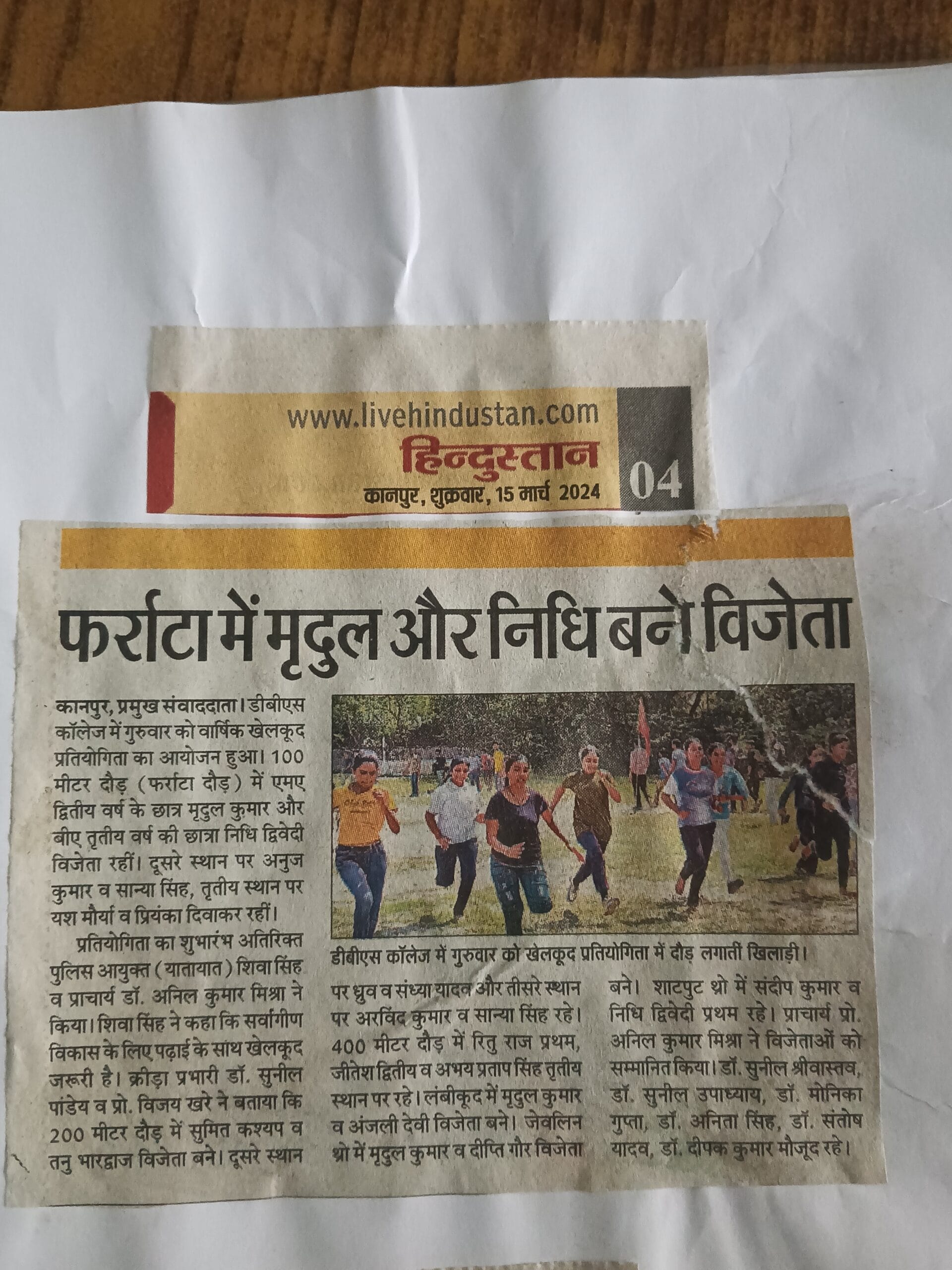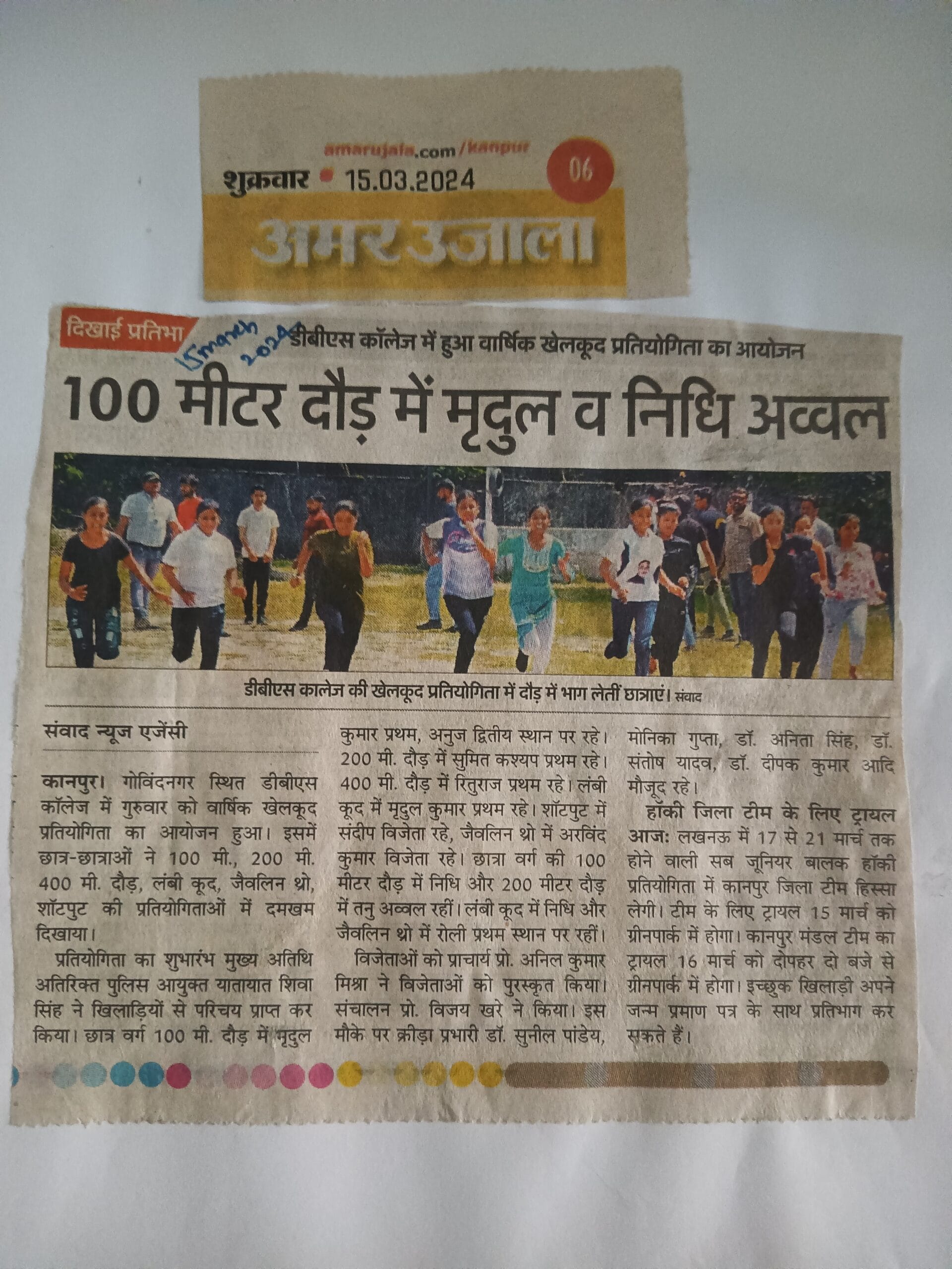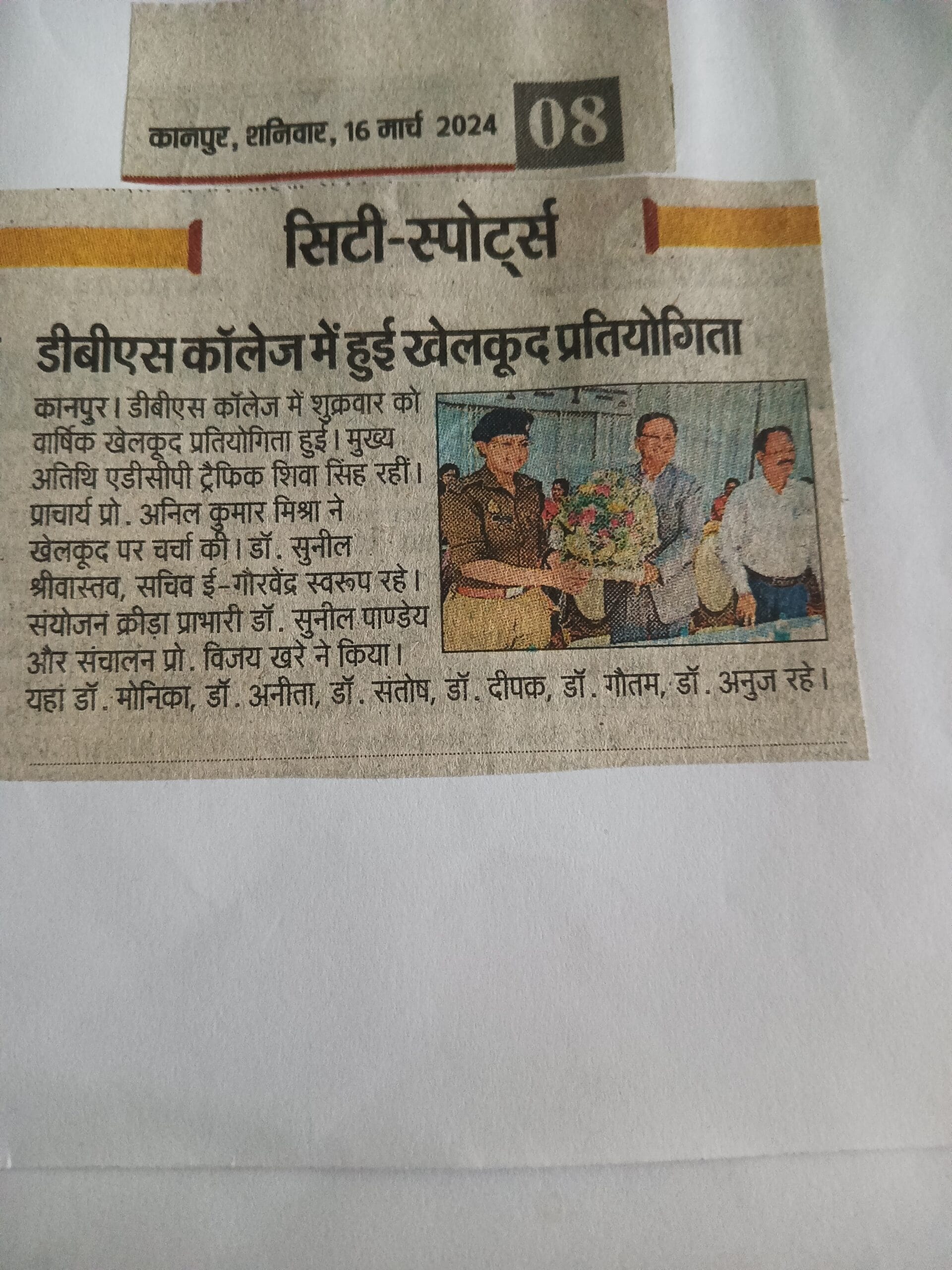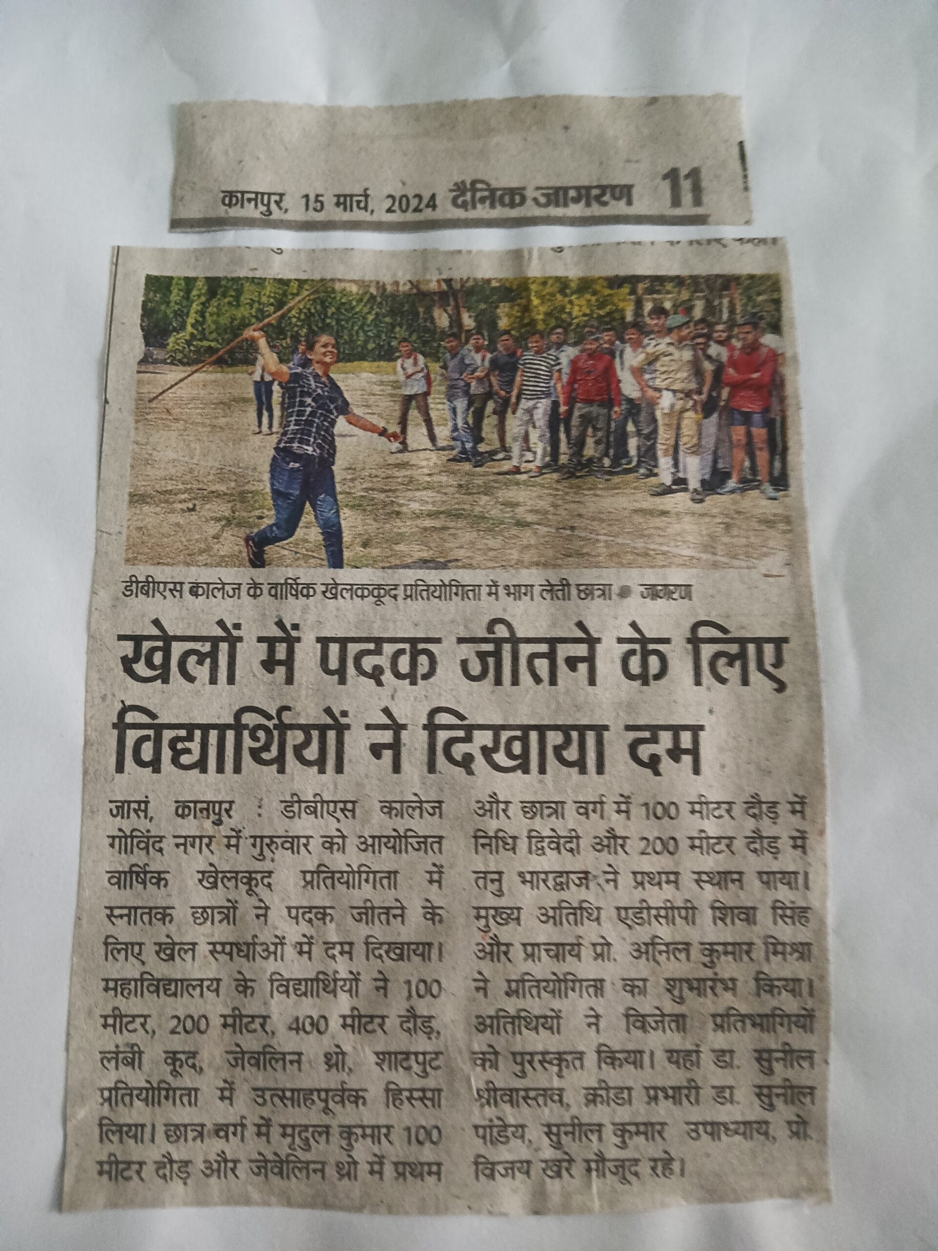 डी.बी.एस. पीजी कॉलेज कानपुर में दिनांक 13 मार्च 2024 को महाविद्यालय की स्पोर्ट कमेटी के द्वारा वार्षिक खेलकूद प्रतियोगिता का सफलतापूर्वक आयोजन किया गया। इस खेलकूद प्रतियोगिता में महाविद्यालय के छात्र-छात्राओं ने बढ़-चढ़कर भागीदारी की। महाविद्यालय के क्रीड़ा अधिकारी डॉ सुनील कुमार पांडेय के द्वारा यह बताया गया कि इस वार्षिक खेलकूद प्रतियोगिता में विद्यार्थियों ने 100 मीटर, 200 मीटर, 400 मीटर लंबी दौड़, ऊंची कूद, लंबी कूद, जैवलिन थ्रो शॉट पुट प्रतियोगिताओं में अपनी भागीदारी की। प्रतियोगिता का शुभारंभ मुख्य अतिथि अतिरिक्त पुलिस आयुक्त यातायात शिवा सिंह जी ने खिलाड़ियों से परिचय प्राप्त कर किया। प्रतियोगिता में विजेता छात्र-छात्राओं को महाविद्यालय के प्राचार्य प्रो. अनिल कुमार मिश्रा, आइक्यूएसी कोऑर्डिनेटर प्रो. के.के. श्रीवास्तव एवं इतिहास विभाग के अध्यक्ष प्रो. विजय कुमार खरे एवं डॉ सुनील कुमार श्रीवास्तव के द्वारा पुरस्कार वितरण किया गया।