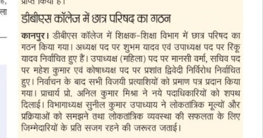 आज दिनांक 01/10/2024 को डीवीएस कॉलेज कानपुर के शिक्षक शिक्षा विभाग में छात्र परिषद का गठन किया गया। अध्यक्ष पद पर शुभम यादव एवं उपाध्यक्ष पद पर रिंकू यादव निर्वाचित हुए उपाध्यक्ष (महिला) पद पर मानसी वर्मा ,सचिव पद पर महेश कुमार एवं कोषाध्यक्ष पद पर प्रशांत द्विवेदी निर्विरोध निर्वाचित हुए । निर्वाचन के बाद सभी विजय प्रत्याशियों को प्रमाण पत्र प्रदान किया गया। प्राचार्य प्रोफेसर अनिल कुमार मिश्रा ने अपने नए पदाधिकारी को शपथ दिलाई ।विभागाध्यक्ष सुनील कुमार उपाध्याय ने लोकतांत्रिक मूल्य और प्रक्रियाओं को समझने तथा लोकतांत्रिक व्यवस्था की सफलता के लिए जिम्मेदारियां के प्रति सजग रहने की जरूरत बताई।