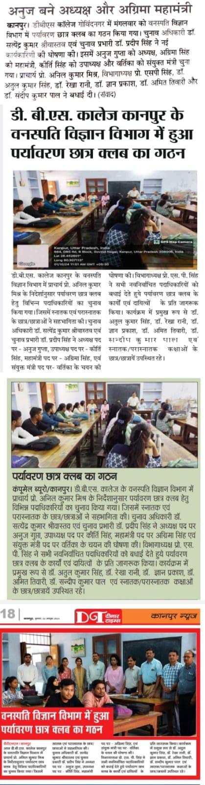 आज दिनाँक 01.10.2024 को डी.बी.एस. कालेज कानपुर के वनस्पति विज्ञान विभाग में प्राचार्य प्रो. अनिल कुमार मिश्र के निर्देशानुसार *पर्यावरण छात्र क्लब* हेतु विभिन्न पदाधिकारियों का चुनाव किया गया। जिसमें स्नातक एवं परास्नातक के छात्र/छात्राओं ने सहभागिता की। चुनाव अधिकारी डॉ. सत्येंद्र कुमार श्रीवास्तव एवं चुनाव प्रभारी डॉ. प्रदीप सिंह ने अध्यक्ष पद पर – अनुज गुप्ता, उपाध्यक्ष पद पर – कीर्ति सिंह, महामंत्री पद पर – अग्रिमा सिंह, एवं संयुक्त मंत्री पद पर- वर्तिका के चयन की घोषणा की। विभागाध्यक्ष प्रो. एस. पी. सिंह ने सभी नवनिर्वाचित पदाधिकारियों को बधाई देते हुये पर्यावरण छात्र क्लब के कार्यों एवं दायित्वों के प्रति जागरूक किया। कार्यक्रम में प्रमुख रूप से डॉ. अतुल कुमार सिंह, डॉ. रेखा रानी, डॉ. ज्ञान प्रकाश, डॉ. अमित तिवारी, डॉ. सन्दीप कुमार पाल एवं स्नातक/परास्नातक कक्षाओं के छात्र/छात्रायें उपस्थित रहे।