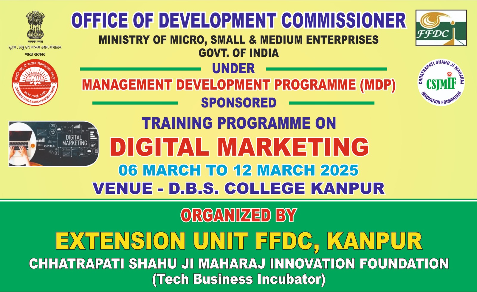 In today’s digital era, marketing strategies have evolved significantly, emphasising online platforms to reach a broader audience. Recognising the importance of digital literacy, DBS College, Kanpur, in collaboration with Chhatrapati Shahu Ji Maharaj University, is organising a five-day Digital Marketing Training Program. The event is being held under the Management Development Program (MDP) with support from the Ministry of Micro, Small, and Medium Enterprises (MSME), Government of India.