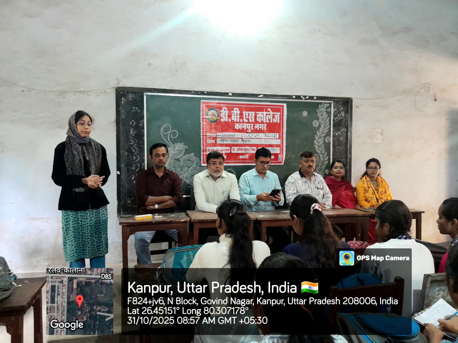 भारत के लौह पुरुष एवं राष्ट्रीय एकता के सूत्रधार सरदार वल्लभभाई पटेल की 150वीं जयंती के उपलक्ष्य में आज दिनांक 31 अक्टूबर 2025 को इतिहास विभाग, डी.बी.एस. कॉलेज,कानपुर के द्वारा एक व्याख्यान कार्यक्रम का आयोजन किया गया, जिसमें इतिहास विभाग के शिक्षकों के द्वारा विद्यार्थियों को सरदार वल्लभभाई पटेल से प्रेरणा लेते हुए राष्ट्रीय एकता हेतु संदेश दिया गया। कार्यक्रम के संयोजक के रूप में डॉ. सुनील कुमार पांडेय ने विद्यार्थियों का उत्साह वर्धन करते हुए भारत के राष्ट्रीय एकता के प्रेरक सरदार वल्लभभाई पटेल के विषय में विद्यार्थियों का ज्ञानवर्धन किया। कार्यक्रम में महाविद्यालय के एनएसएस प्रभारी डॉ.गौरव सिंह ने उपस्थित रहकर विद्यार्थियों को सरदार वल्लभभाई पटेल के राष्ट्रीय योगदानों एवं वर्तमान संदर्भ में राष्ट्रीय एकता की चुनौतियों एवं संभावनाओं को विस्तार से बताया। कार्यक्रम में मुख्य वक्ता के रूप में डॉ. कृष्ण देव यादव ने विद्यार्थियों को सरदार वल्लभभाई पटेल के जीवन मूल्यों से प्रेरित होने एवं वर्तमान में राष्ट्रीय एकता के प्रति समर्पण हेतु उनसे सीखने के लिए संदेश दिया। कार्यक्रम में विद्यार्थियों ने भी बढ़-चढ़ के भाग लिया और अपने विचार व्यक्त किये।
