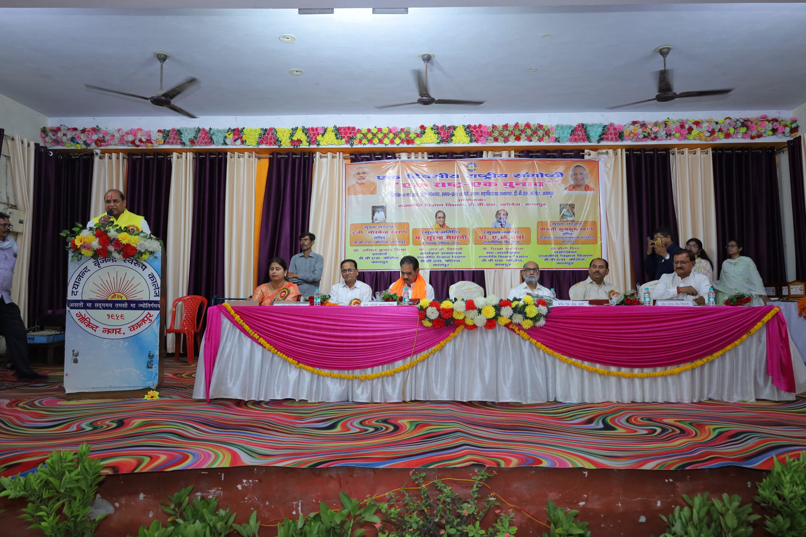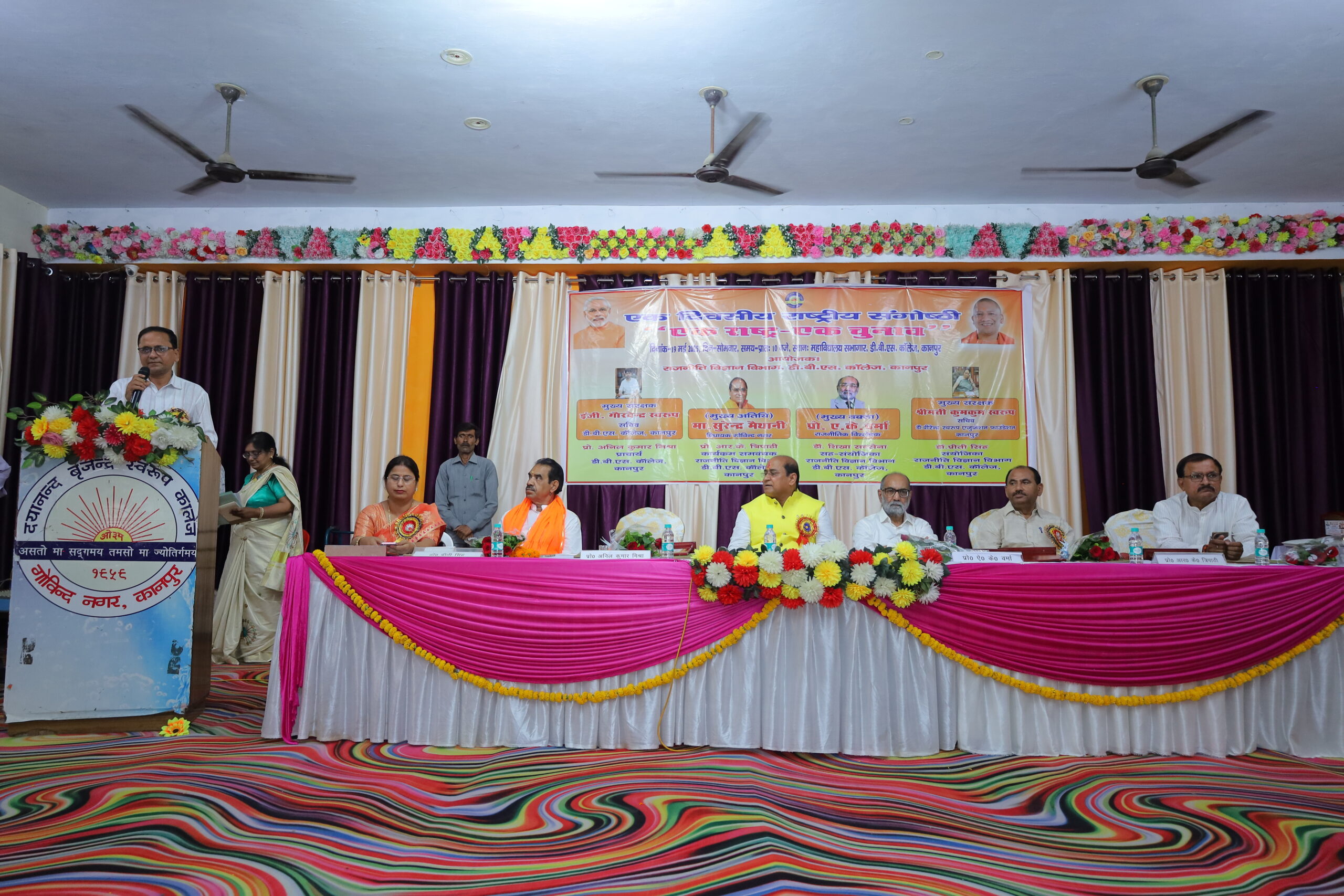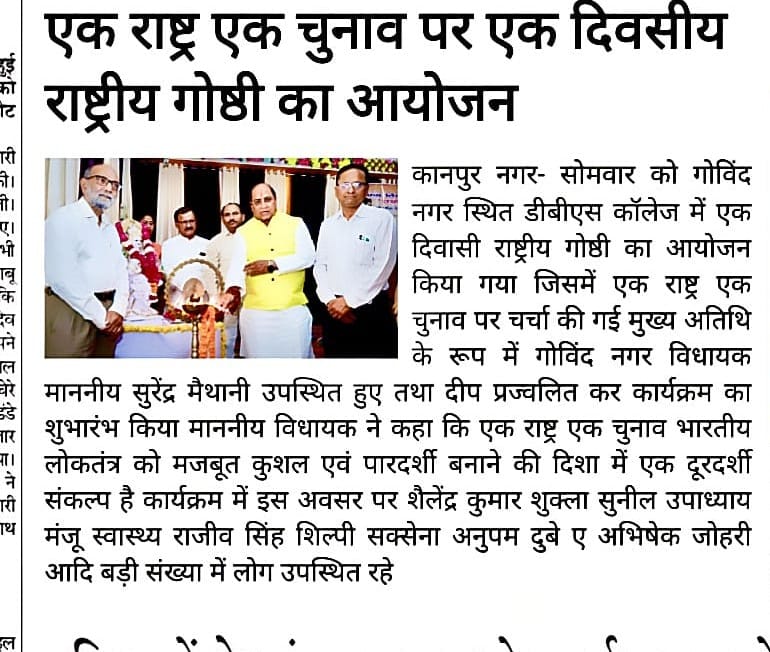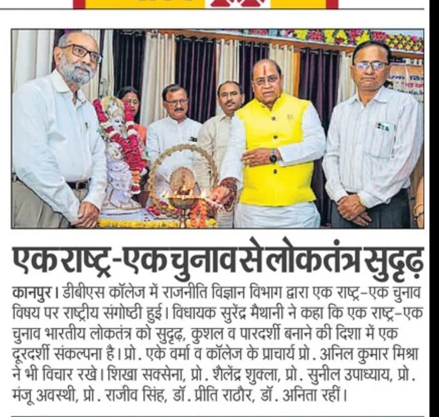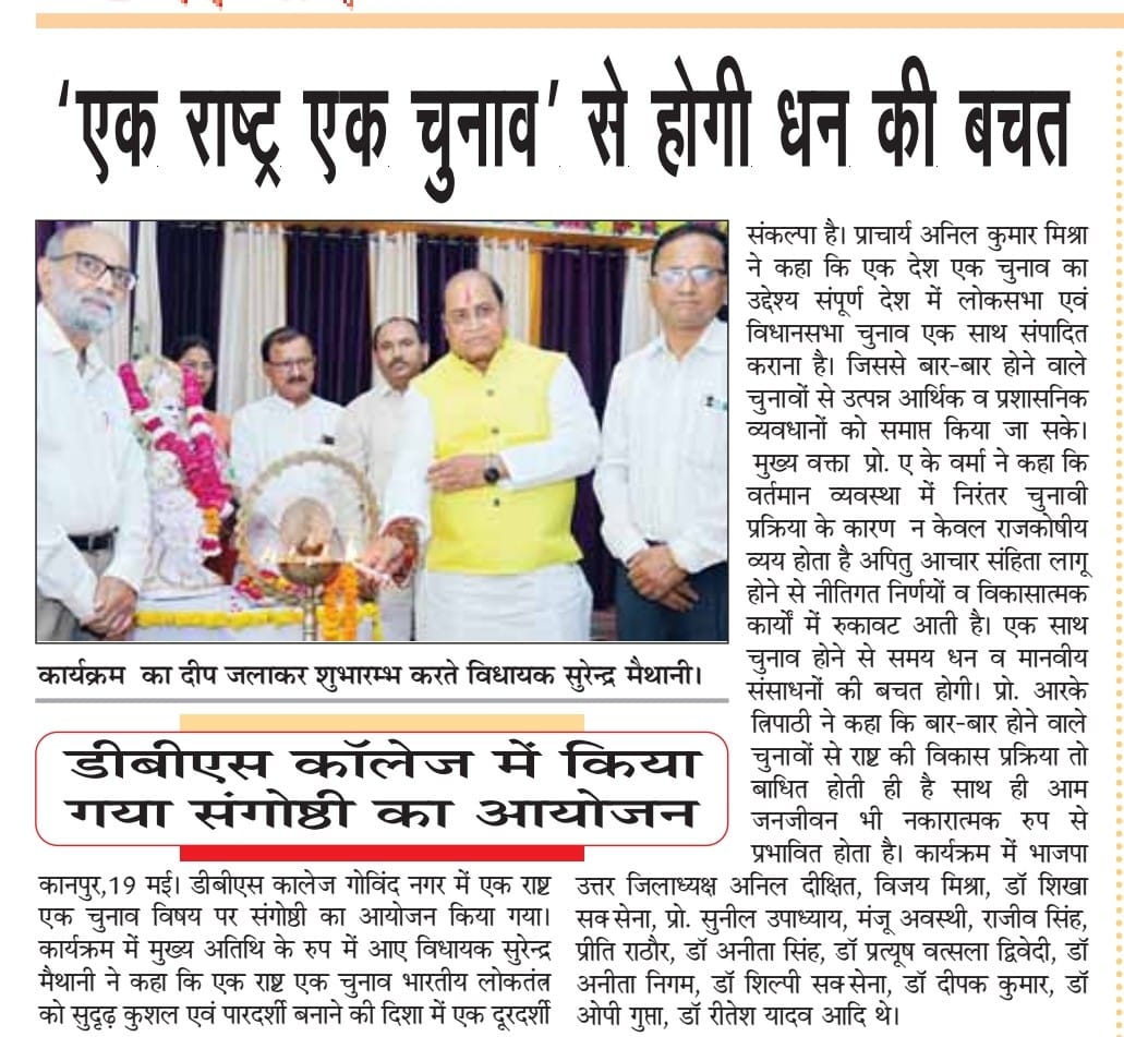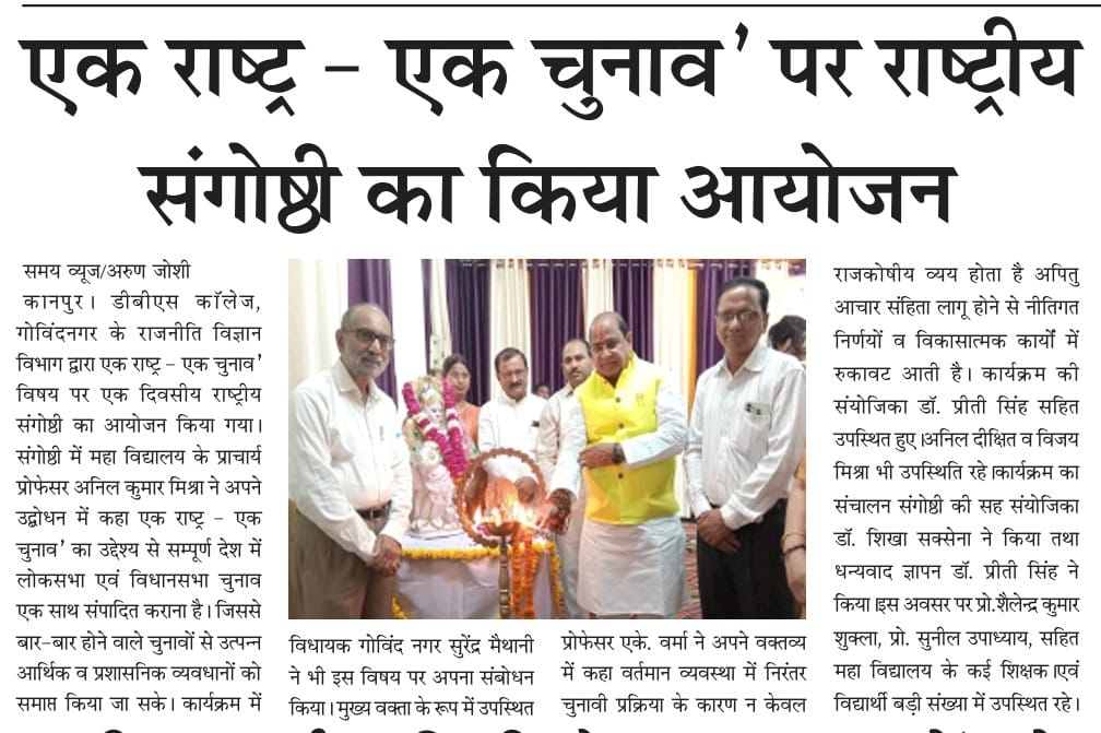 डी.बी.एस. काॅलेज, गोविंदनगर, कानपुर के राजनीति विज्ञान विभाग द्वारा ‘एक राष्ट्र – एक चुनाव’ विषय पर एक दिवसीय राष्ट्रीय संगोष्ठी का आयोजन किया गया। संगोष्ठी का उद्घाटन विद्या की अधिष्ठात्री माँ सरस्वती की प्रतिमा पर पुष्पार्पण व दीप प्रज्वलन के साथ हुआ। संगोष्ठी के आरंभ में अध्यक्षीय भाषण देते हुए महाविद्यालय के प्राचार्य प्रो. अनिल कुमार मिश्रा ने अपने उद्बोधन में कहा ‘एक राष्ट्र – एक चुनाव’ का उद्देश्य सम्पूर्ण देश में लोकसभा एवं विधानसभा चुनाव एक साथ संपादित कराना है। जिससे बार-बार होने वाले चुनावों से उत्पन्न आर्थिक, प्रशासनिक व विकासात्मक व्यवधानों को समाप्त किया जा सके। कार्यक्रम में मुख्य अतिथि के रूप में गोविंद नगर विधानसभा क्षेत्र के विधायक माननीय सुरेन्द्र मैथानी जी की गरिमामयी उपस्थिति रही। माननीय विधायक जी ने अपने उद्बोधन में कहा कि ‘एक राष्ट्र- एक चुनाव’ भारतीय लोकतंत्र को सुदृढ़, कुशल एवं पारदर्शी बनाने की दिशा में एक दूरदर्शी संकल्पना है। कार्यक्रम में मुख्य वक्ता के रूप में उपस्थित प्रो. ए. के. वर्मा ने अपने वक्तव्य में कहा वर्तमान व्यवस्था में निरंतर चुनावी प्रक्रिया के कारण न केवल राजकोषीय व्यय होता है अपितु आचार संहिता लागू होने से नीतिगत निर्णयों व विकासात्मक कार्यों में रुकावट आती है। एक साथ चुनाव होने से समय, धन व मानवीय संसाधनों की बचत होगी। कार्यक्रम समन्वयक प्रो. आर.के. त्रिपाठी ने अपने वक्तव्य में कहा कि बार- बार होने वाले चुनावों से राष्ट्र की विकास प्रक्रिया तो बाधित होती ही है साथ ही आम जनजीवन भी नकारात्मक रूप से प्रभावित होता है। कार्यक्रम की संयोजिका डॉ. प्रीती सिंह ने अपने वक्तव्य में कहा निरंतर चुनावों के होते रहने से राष्ट्र को आर्थिक रूप से बहुत क्षति उठानी पड़ती है। एक राष्ट्र ‘एक राष्ट्र एक चुनाव’ से चुनाव में होने वाले संसाधनों के क्षय को राष्ट्र के विकास में नियोजित किया जा सकेगा। मंच में श्री अनिल दीक्षित व श्री विजय मिश्रा की भी गरिमामयी उपस्थिति रही। कार्यक्रम का संचालन संगोष्ठी की सह संयोजिका डाॅ. शिखा सक्सेना ने किया तथा धन्यवाद ज्ञापन डॉ. प्रीती सिंह ने किया। इस अवसर पर प्रो. शैलेन्द्र कुमार शुक्ला, प्रो. सुनील उपाध्याय, प्रो. मंजू अवस्थी, प्रो. राजीव सिंह, डॉ. प्रीती राठौर, डाॅ. अनिता सिंह, डॉ. प्रत्यूष वत्सला द्विवेदी, डॉ. गौतम हाल, डॉ. अनीता निगम, डॉ. शिल्पी सक्सेना, डॉ. दीपक कुमार, डॉ. ओ.पी. गुप्ता, डॉ. रीतेश यादव, डॉ. अनुपम दुबे, डॉ. स्वदेश कुमार गुप्ता, डॉ. अभिषेक जौहरी व श्री शिव नारायण सिंह सहित महाविद्यालय के शोधार्थी एवं विद्यार्थी बड़ी संख्या में उपस्थित रहे।
