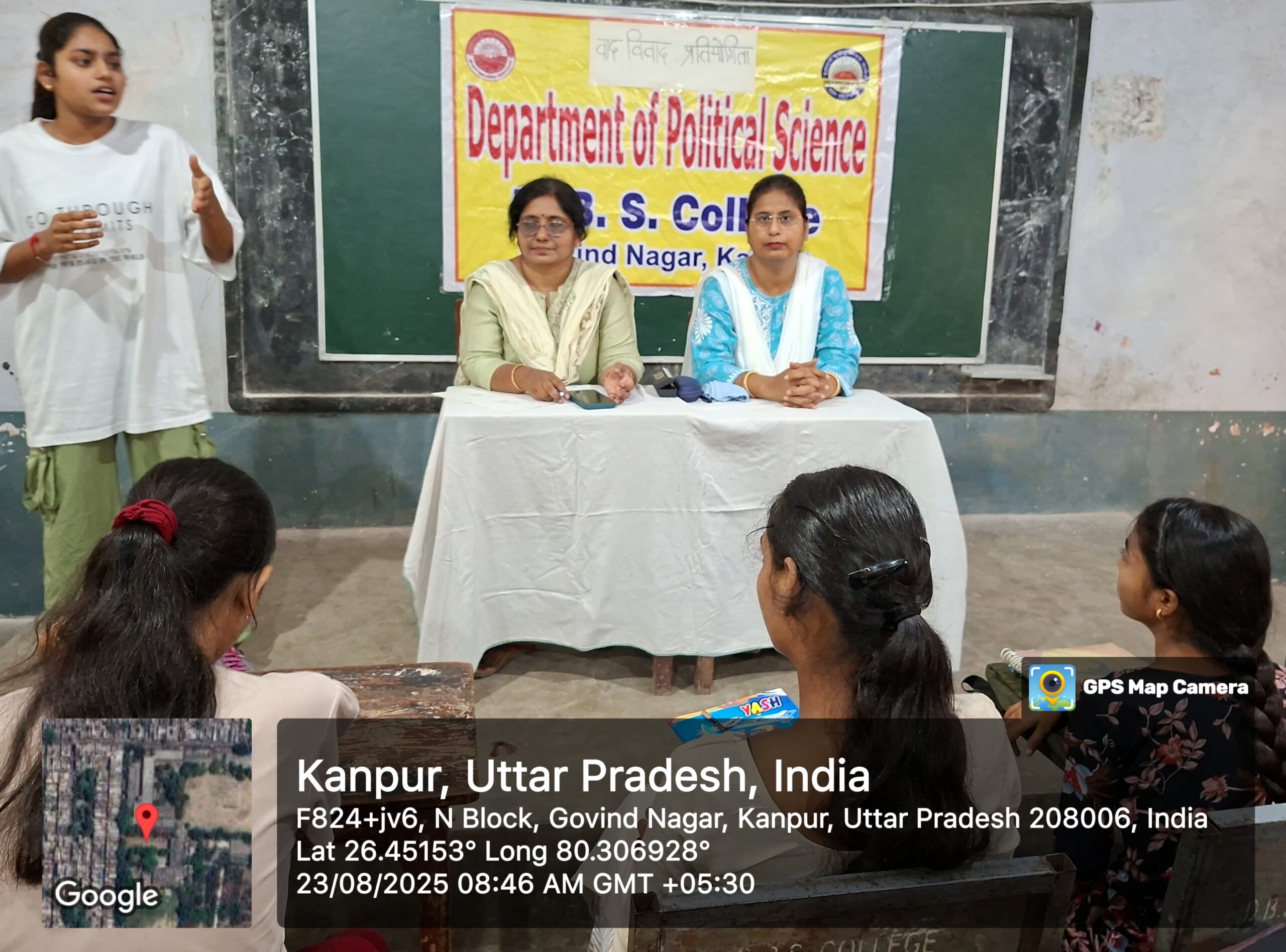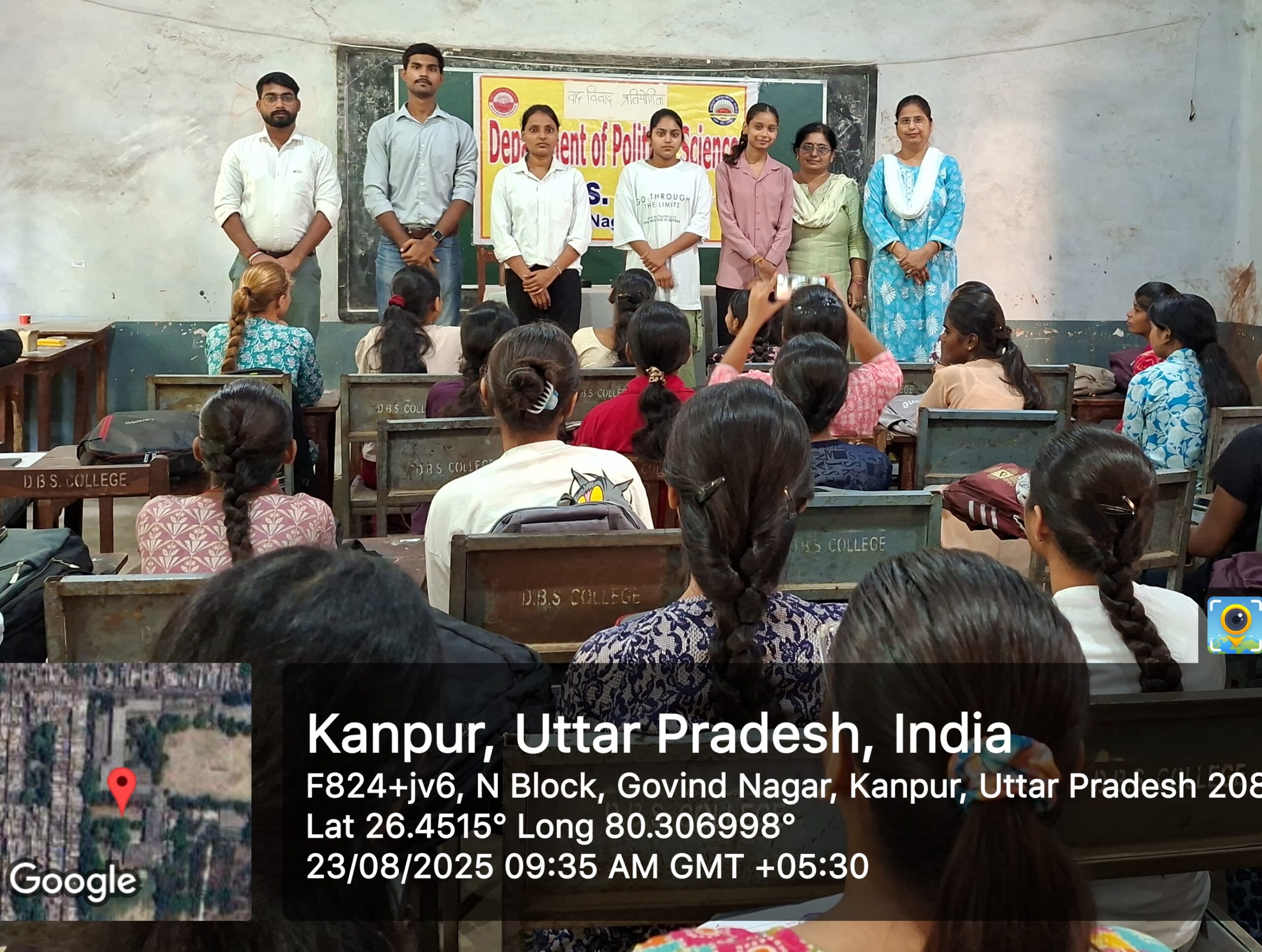 दिनांक 23 अगस्त 2025 को राजनीति विज्ञान विभाग डी.बी.एस. कॉलेज, कानपुर द्वारा ‘युवा वर्ग एवं सोशल मीडिया’ विषय पर वाद विवाद प्रतियोगिता का आयोजन किया गया। इस कार्यक्रम में छात्र-छात्राओं ने उत्साहपूर्ण भाग लिया एवं पक्ष विपक्ष में अपने विचार प्रस्तुत किए। प्रतियोग्यता में बी.ए. 3rd सेमेस्टर की अनामिका ने प्रथम, बी. ए. 5th सेमेस्टर के अभिषेक प्रजापति ने द्वितीय, बी. ए. फर्स्ट सेमेस्टर की दुर्गा एवं प्रिया यादव ने तृतीय स्थान प्राप्त किया। सांत्वना पुरस्कार बी.ए. प्रथम सेमेस्टर के गौरव प्रजापति को मिला। राजनीति विज्ञान की विभागाध्यक्ष डॉक्टर प्रीति सिंह ने छात्र-छात्राओं का उत्साह वर्धन करते हुए कहा कि विभाग सदा से ही छात्राओं के लिए चौहमुखी प्रगति के लिए इस तरह के कार्यक्रम का आयोजन करता रह रहा है और आगे भी करता रहेगा।