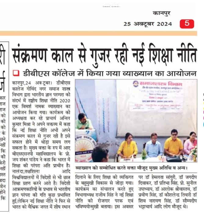 आज दिनांक 24/10/2024 को डी बी एस महाविद्यालय के समाजशास्त्र विभाग द्वारा ” “*भारतीय ज्ञान परम्परा के संदर्भ में राष्ट्रीय शिक्षा नीति 2020: एक विमर्श”* नामक विषय पर व्याख्यान का आयोजन किया गया। कार्यक्रम की अध्यक्षता कर रहे महाविद्यालय के प्राचार्य प्रो.अनिल कुमार मिश्रा जी ने अपने वक्तव्य में कहा कि नई शिक्षा नीति अभी अपने संक्रमण काल से गुजर रही हैं इसे सफल होने में थोड़ा समय लग सकता हैं। कार्यक्रम मे मुख्य वक्ता के रूप में पधारे बी एस एन पी महाविद्यालय के प्रो जय शंकर पाण्डेय ने अपने वक्तव्य में कहा कि भारत में शिक्षा की परंपरा अति प्राचीन हैं। नालंदा, तक्षशिला आदि विश्वविद्यालयों में विदेशों से भी छात्र शिक्षा ग्रहण करने आते थे। विदेशी आक्रमणकारियों के प्रभाव से भारतीय ज्ञान परम्परा की गति कुछ प्रभावित हुई लेकिन नई शिक्षा नीति ने फिर से भारत को वैश्विक जगत में शीर्ष स्थान दिलाने के लिए शिक्षा को व्यक्तित्व के बहुमुखी विकास से जोड़ा गया है। आपने आजरण को प्राथमिक ज्ञान तथा शैक्षिक ज्ञान को द्वितीयक ज्ञान कहा। कार्यक्रम का संचालन करते हुए विभागाध्यक्ष प्रो.राजीव सिंह ने नई शिक्षा नीति को रोजगारपरक एवं भविष्योन्मुखी बताया। कार्यक्रम में विभाग की डॉ. हेमलता सांगुरी, डॉ जगदीप दिवाकर, डॉ प्रतिभा सिंह, बी एड के विभागाध्यक्ष प्रो सुनील उपाध्याय, डॉ आलोक श्रीवास्तव, डॉ प्रवीण सिंह, डॉ कौशलेंद्र तिवारी, डॉ शिव नारायण सिंह, डॉ सौम्यदीप भट्टाचार्य एवं छात्र/छात्राएं उपस्थित रहे।