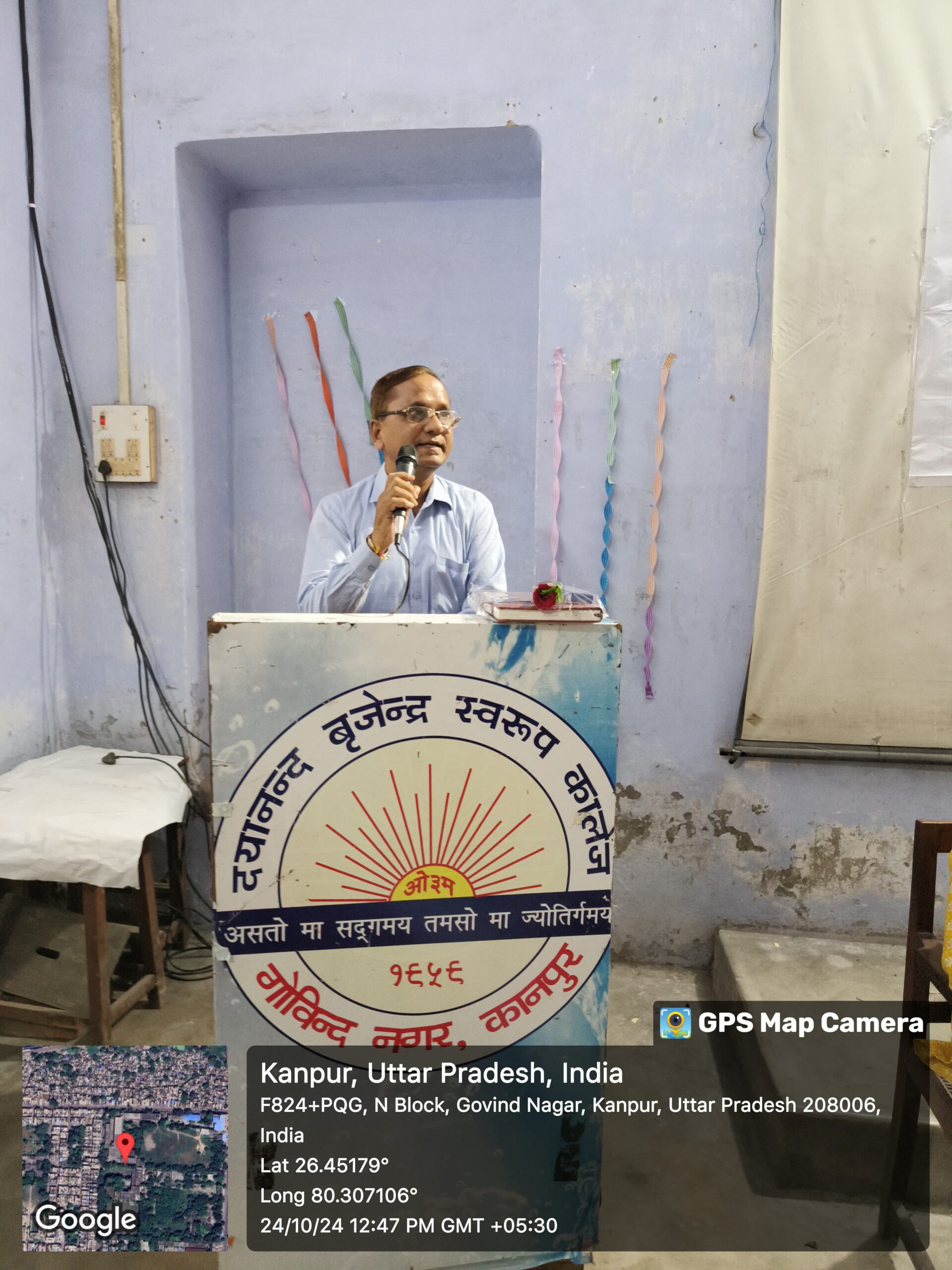 आज दिनांक 24/10/2024 को डी बी एस महाविद्यालय के समाजशास्त्र विभाग द्वारा ” “*भारतीय ज्ञान परम्परा के संदर्भ में राष्ट्रीय शिक्षा नीति 2020: एक विमर्श”* नामक विषय पर व्याख्यान का आयोजन किया गया। कार्यक्रम की अध्यक्षता कर रहे महाविद्यालय के प्राचार्य प्रो.अनिल कुमार मिश्रा जी ने अपने वक्तव्य में कहा कि नई शिक्षा नीति अभी अपने संक्रमण काल से गुजर रही हैं इसे सफल होने में थोड़ा समय लग सकता हैं। कार्यक्रम मे मुख्य वक्ता के रूप में पधारे बी एस एन पी महाविद्यालय के प्रो जय शंकर पाण्डेय ने अपने वक्तव्य में कहा कि भारत में शिक्षा की परंपरा अति प्राचीन हैं। नालंदा, तक्षशिला आदि विश्वविद्यालयों में विदेशों से भी छात्र शिक्षा ग्रहण करने आते थे। विदेशी आक्रमणकारियों के प्रभाव से भारतीय ज्ञान परम्परा की गति कुछ प्रभावित हुई लेकिन नई शिक्षा नीति ने फिर से भारत को वैश्विक जगत में शीर्ष स्थान दिलाने के लिए शिक्षा को व्यक्तित्व के बहुमुखी विकास से जोड़ा गया है। आपने आजरण को प्राथमिक ज्ञान तथा शैक्षिक ज्ञान को द्वितीयक ज्ञान कहा। कार्यक्रम का संचालन करते हुए विभागाध्यक्ष प्रो.राजीव सिंह ने नई शिक्षा नीति को रोजगारपरक एवं भविष्योन्मुखी बताया। कार्यक्रम में विभाग की डॉ. हेमलता सांगुरी, डॉ जगदीप दिवाकर, डॉ प्रतिभा सिंह, बी एड के विभागाध्यक्ष प्रो सुनील उपाध्याय, डॉ आलोक श्रीवास्तव, डॉ प्रवीण सिंह, डॉ कौशलेंद्र तिवारी, डॉ शिव नारायण सिंह, डॉ सौम्यदीप भट्टाचार्य एवं छात्र/छात्राएं उपस्थित रहे।