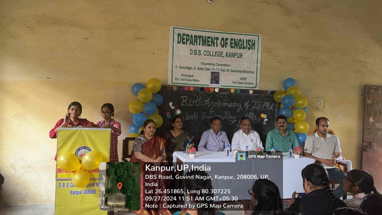 A programme was organised by the Department of English, D. B. S. College, Govind Nagar, Kanpur, on 27/09/2024, to jointly celebrate the Birth Anniversary of T. S. Eliot, which is on 26th September, as well as World Tourism Day which is on 27th September. The occassion was graced by the presence of the respected Principal Prof. Anil Kumar Mishra, who, in his adress, intimated the students about the lofty ideals, and achievements of Eliot and encouraged them to pursue a life of creativity and intellectualism. Also present was Prof. K. K. Srivastava, Convenor, I.Q.A.C., who intimated the students about the importance and necessity of travel and tourism for a fruitful and complete life. Also present in the program were the faculty members of the Department of English, Dr. Seema Nigam, Dr. Rashmi Dubey, Dr. C. P. Singh and Mr. Saumyadeep Bhattacharya, all of whom presented snippets of knowledge to the students intimating them of the various important facets of both the occassions that were being jointly celebrated. The programme was made a grand success by the overwhelming presence as well as participation of the students who also presented lectures on the various importance of T. S. Eliot’s literature as well as travels and tourism.